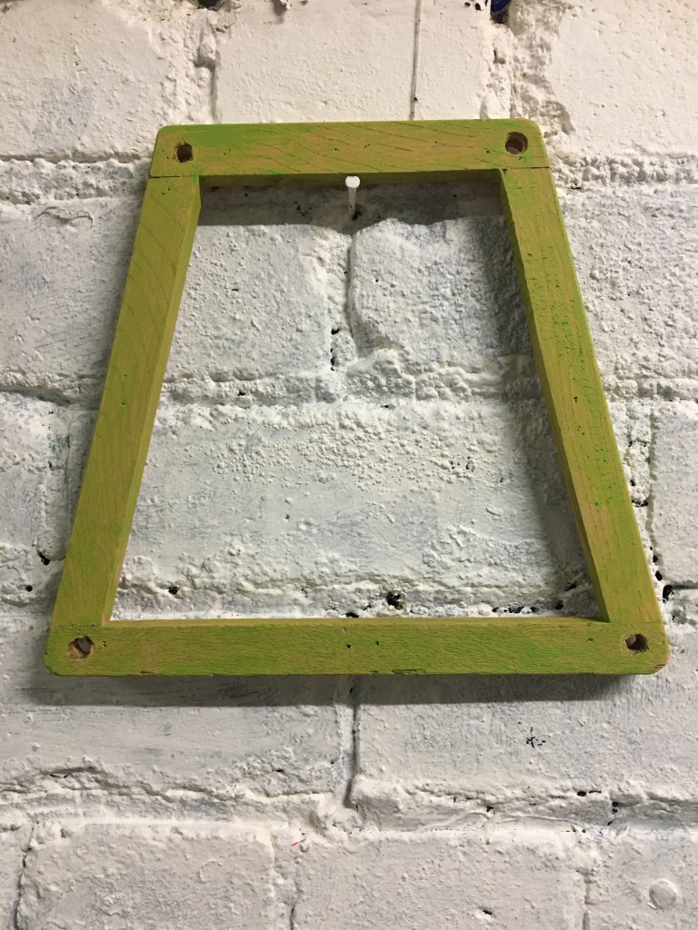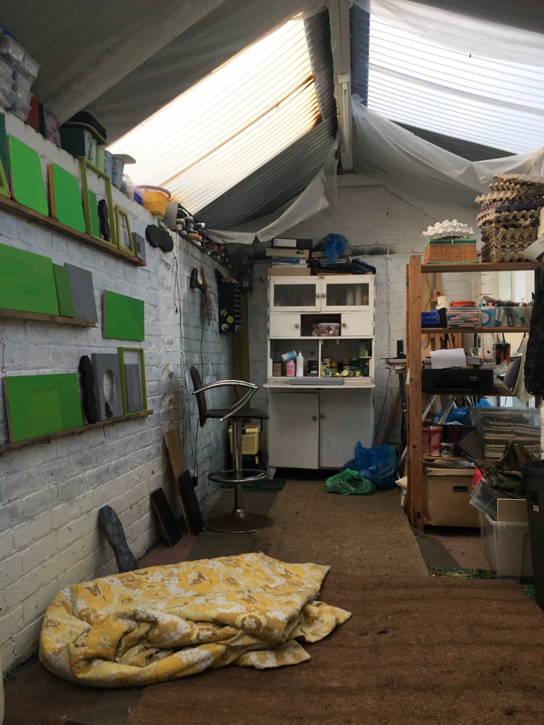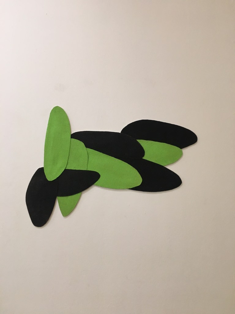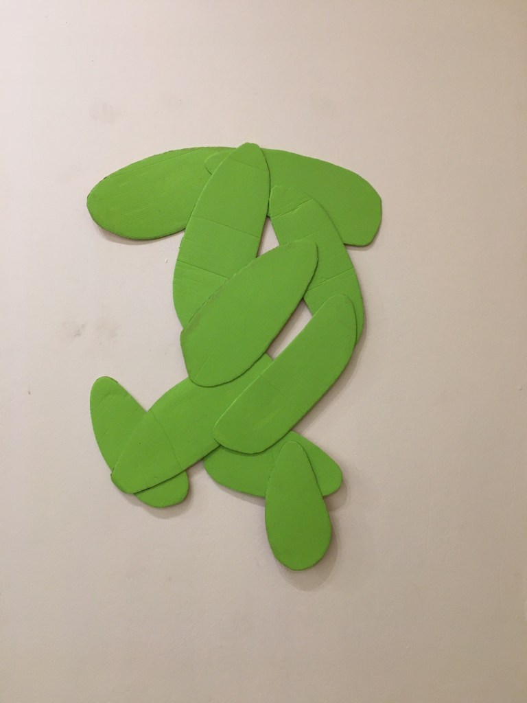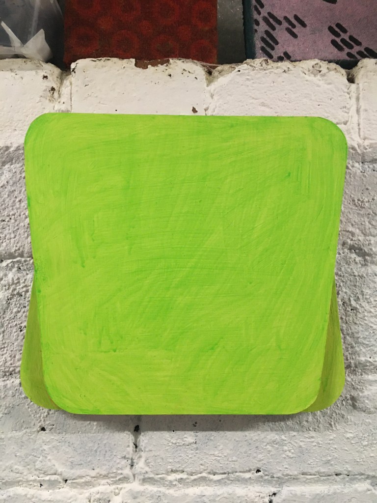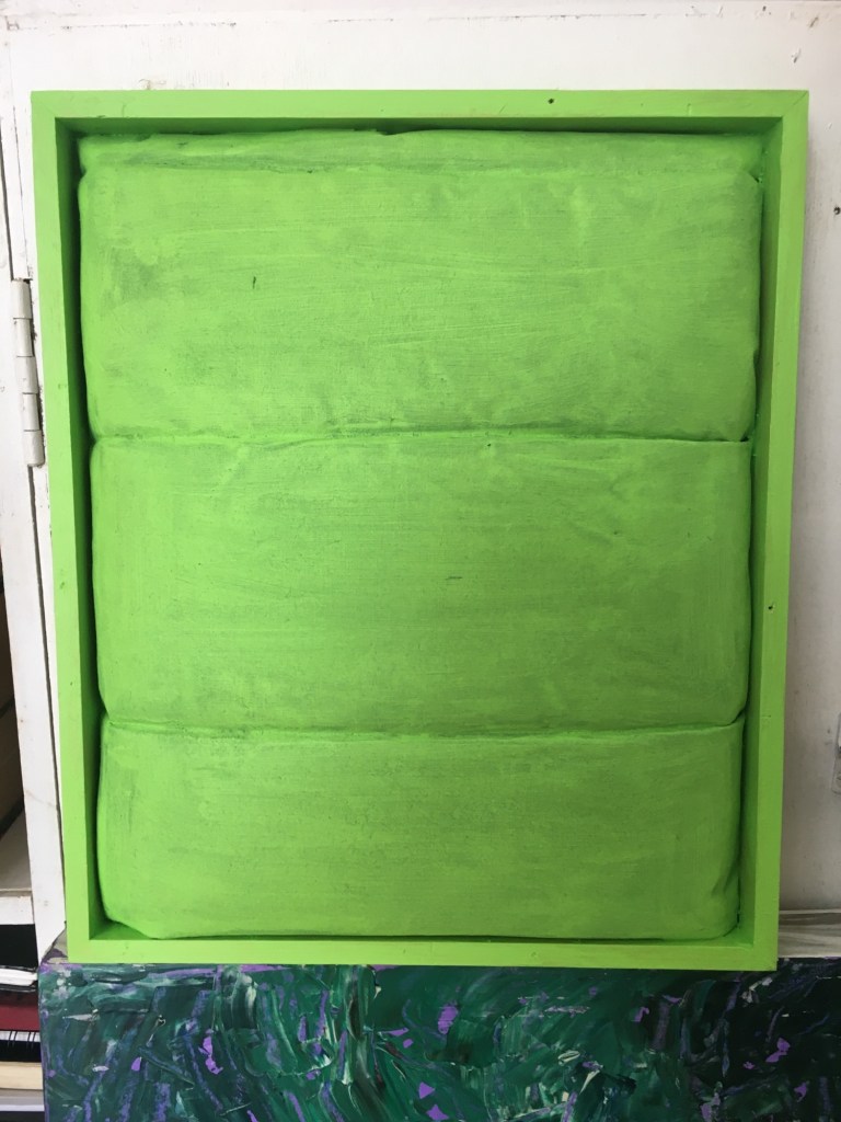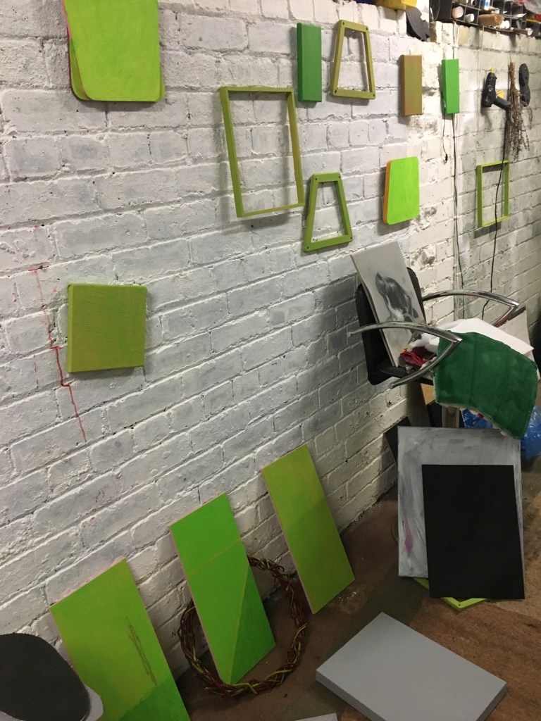 So everything was pink, as I couldn’t stop thinking about the Philip Guston exhibition. Now everything is green as I’ve been listening to a lot of 1980’s house music. Continuing to consider extended painting, positive/negative space and colour. Using recycled cardboard to create shape outside of the borders of the canvas both in front and behind, moving colour out into the space around the canvas. Reading The Book of Trespass which has increases my interest in in debate surrounding borders, ownership and environmental sustainability. Cardboard shapes represent the staples of India, onions, potatoes and rice. Green land reserved for growing food being sold off to builders all over the world, is not only effecting our food supply and costs but our entire environmental future.