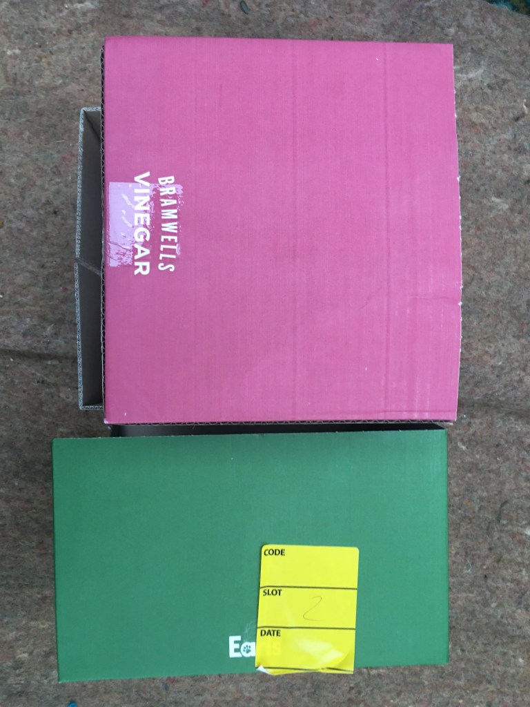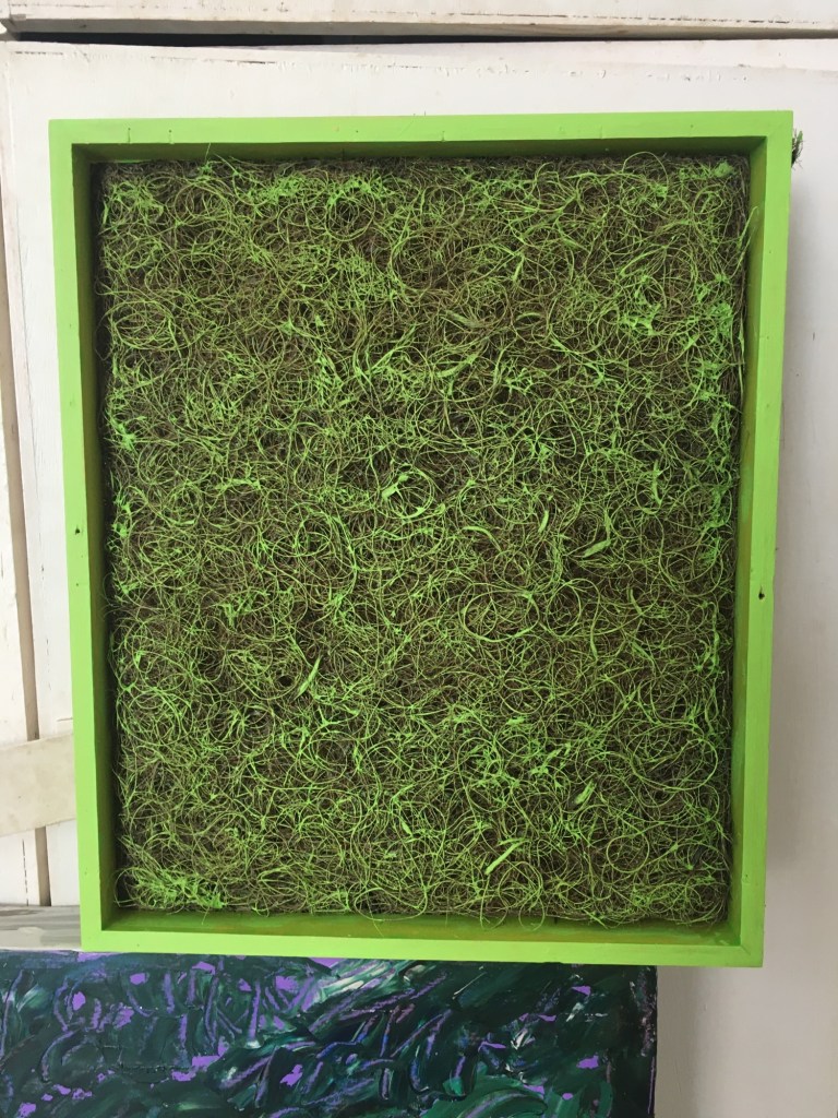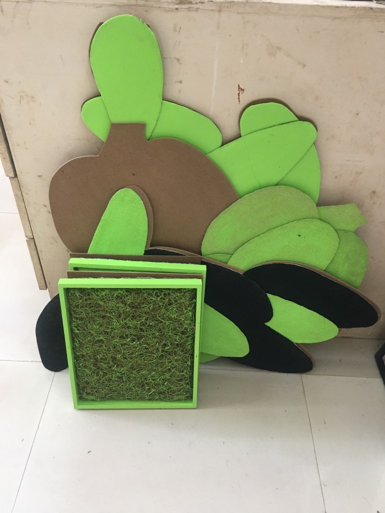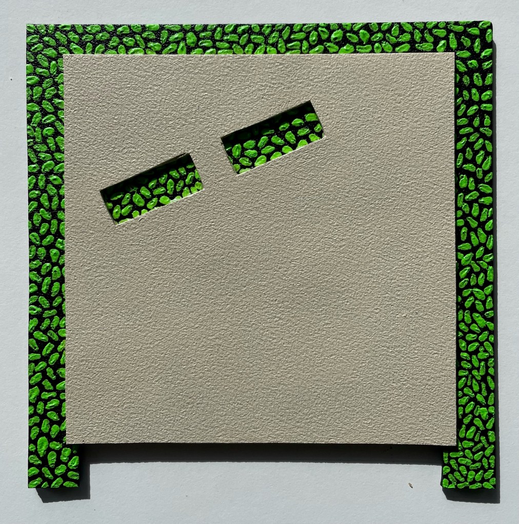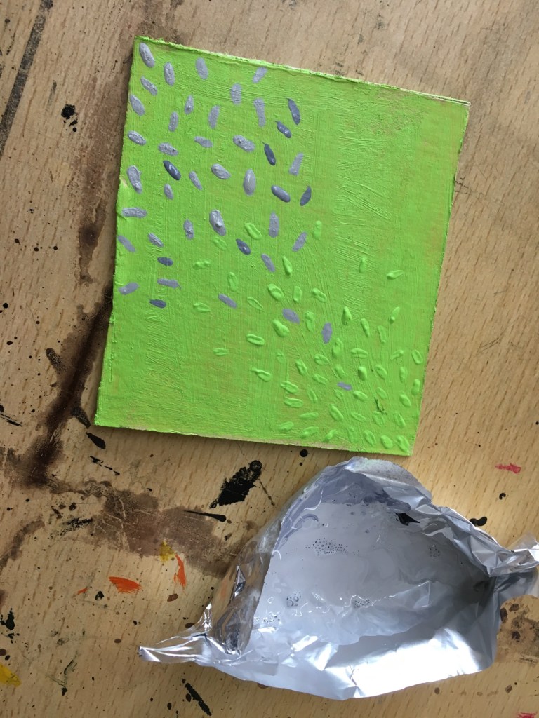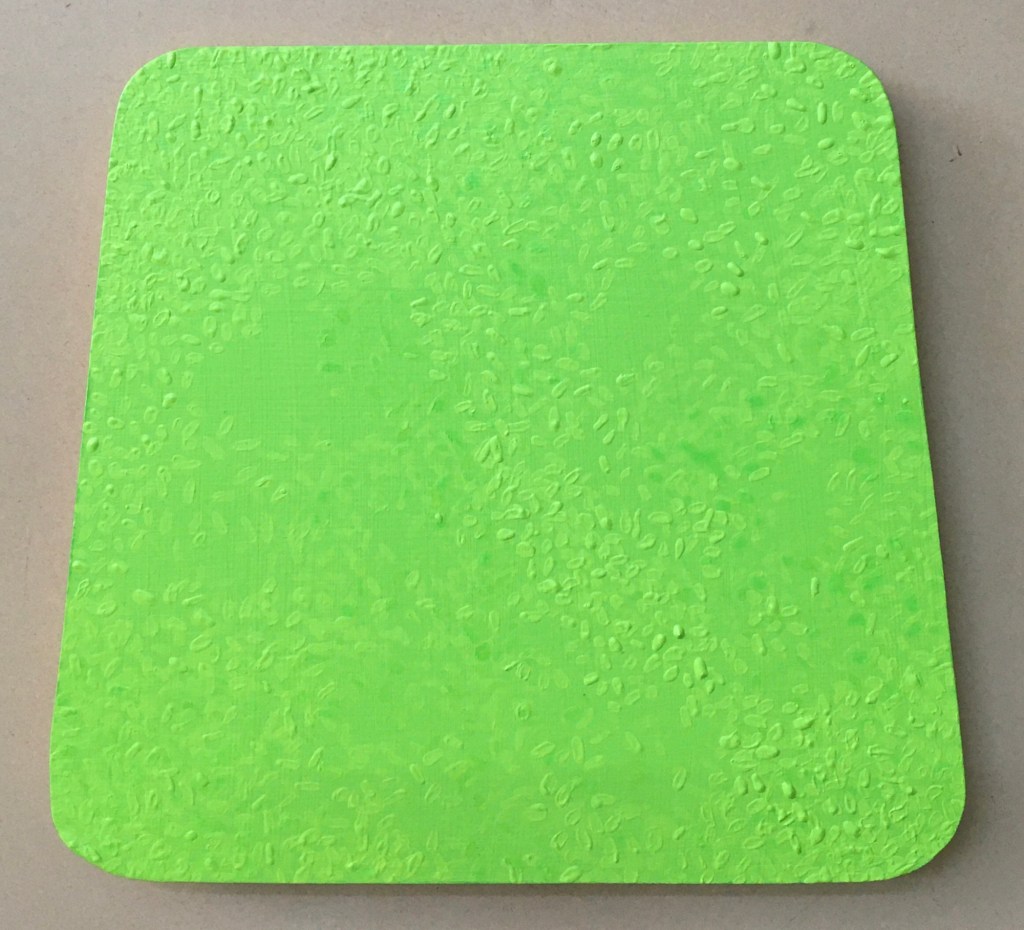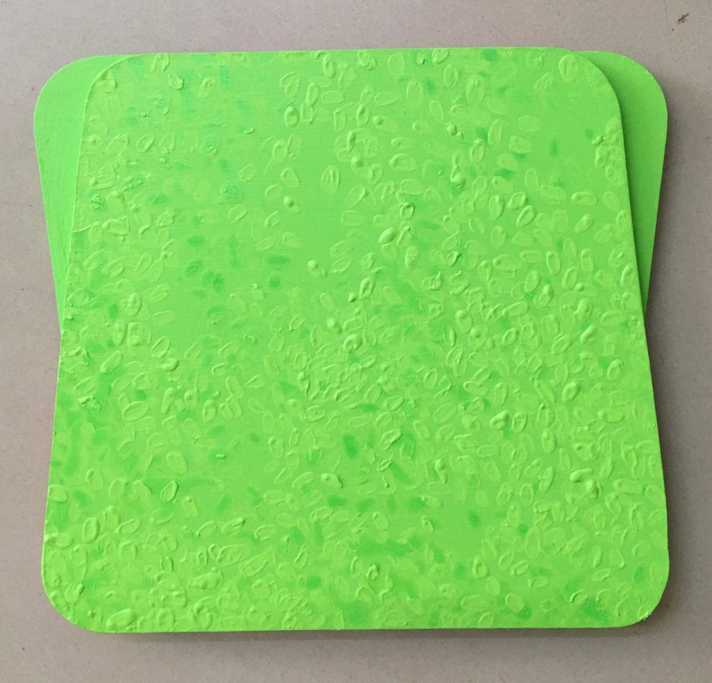 So everything was pink, as I couldn’t stop thinking about the Philip Guston exhibition. Now everything is green as I’ve been listening to a lot of 1980’s house music. Continuing to consider extended painting, positive/negative space and colour. Using recycled cardboard to create shape outside of the borders of the canvas both in front and behind, moving colour out into the space around the canvas. Reading The Book of Trespass which has increases my interest in in debate surrounding borders, ownership and environmental sustainability. Cardboard shapes represent the staples of India, onions, potatoes and rice. Green land reserved for growing food being sold off to builders all over the world, is not only effecting our food supply and costs but our entire environmental future.