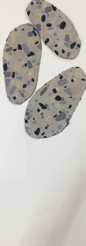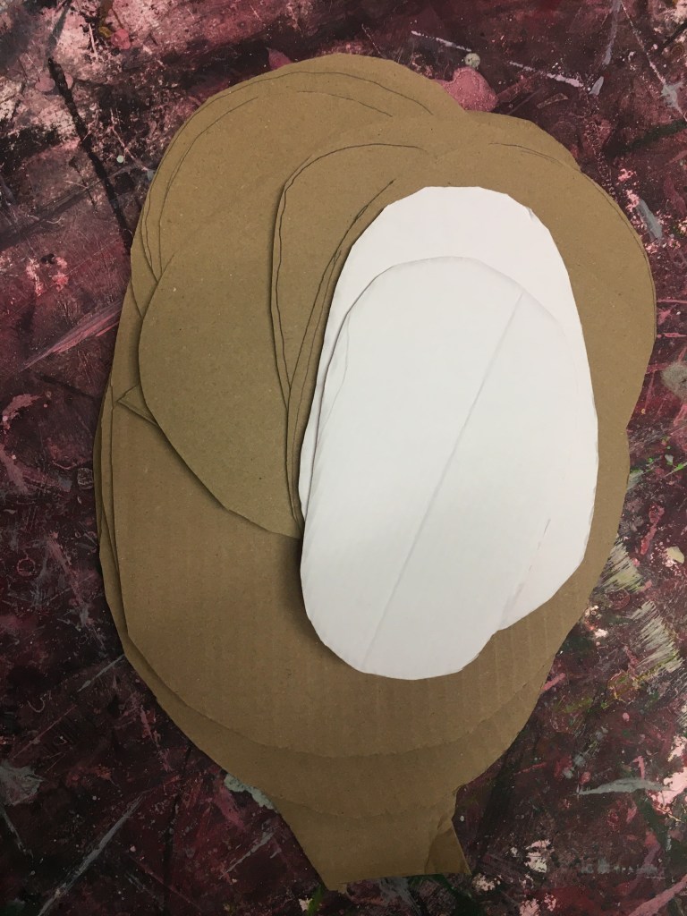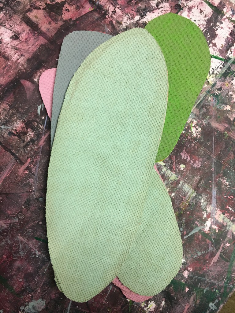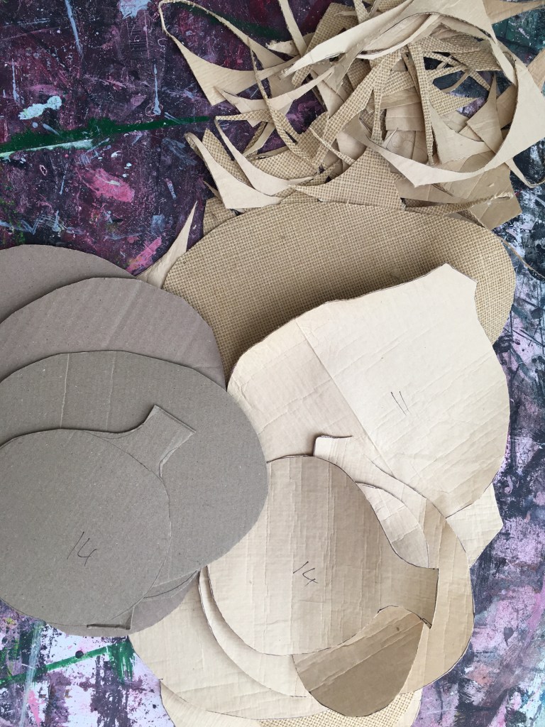 I’ve been working with this material that was donated by my husband who is an upholsterer. He doesn’t know what it is but it is paper with a canvas surface, so I used it to create shapes, it works well when bonded to cardboard. A tip from Kees Van De Wal an abstract minimal artist on how to prevent cardboard from curling in damp atmospheres helped enormously.