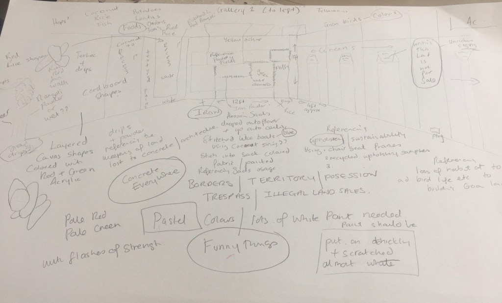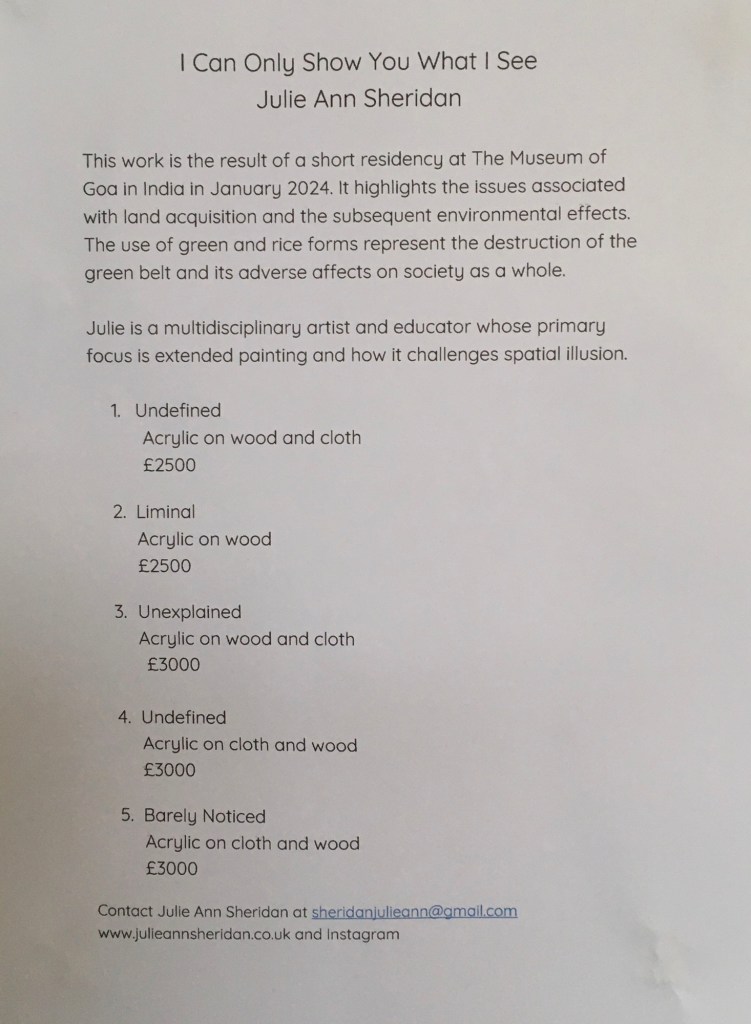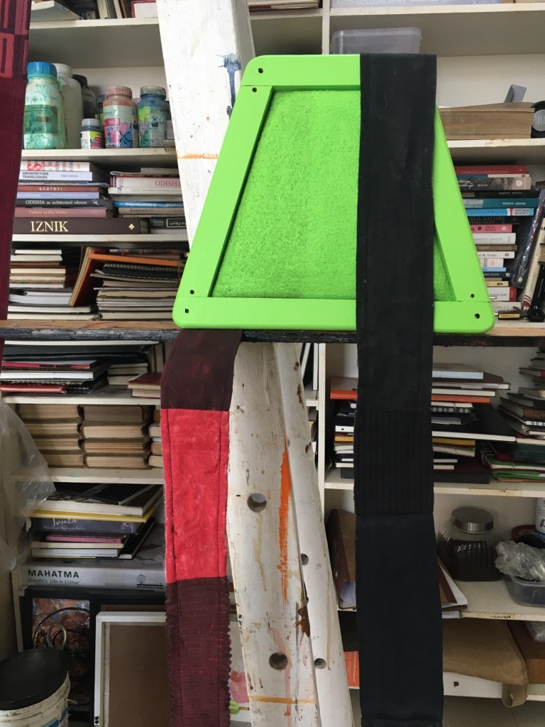 Got here at a reasonable hour after having a few drinks last night and watching the sunset from the balcony of the museum. Spent the morning painting and repainting strips of reused Welsh fabric (from out of date sample books), they were red, became green and are now black. So at least that’s one decision made the primary colours for the show are acid green and black. Green to represents rice, paddy fields and jungle, black the encroachment of uncontrolled development on these precious resources and the inevitable environmental disaster that follows. I’m researching land grabbing in Goa and found an article on Suella Bravemans whose family are victims of this, I don’t know what to think of this as in the UK she anti immigration.