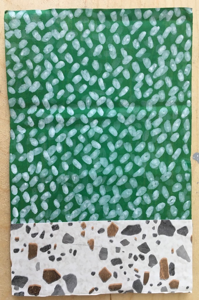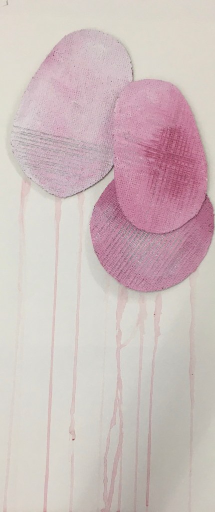 Making these possible connections has led to using cardboard as a surface for paint, (cardboard boxes sourced from a local vegetable supplier). I’m experimenting with rice shapes for abstract elements as a direct link to the loss of historical paddy fields to development.