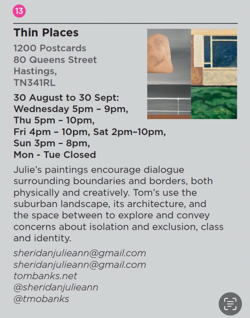 Our joint exhibition opens on 30th August until 30th September at 1200 Postcards in Hastings. Private view 6-8pm 6th Sept. The gallery is upstairs with the excellent bar downstairs. Thanks to Dave for the space.