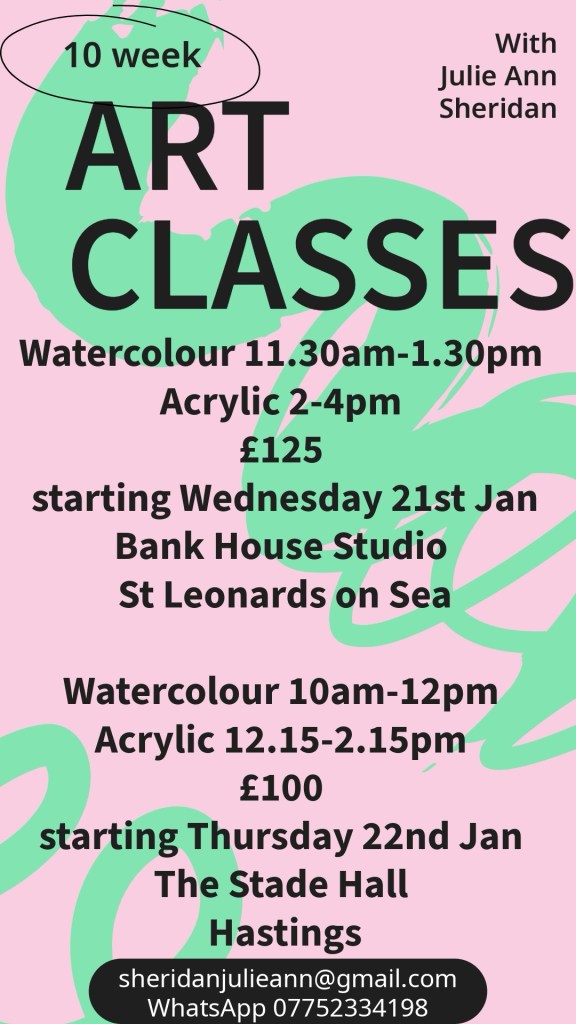 Both classes start on 17th October, Watercolour 10am-12pm and Acrylics 12.15-2.15pm